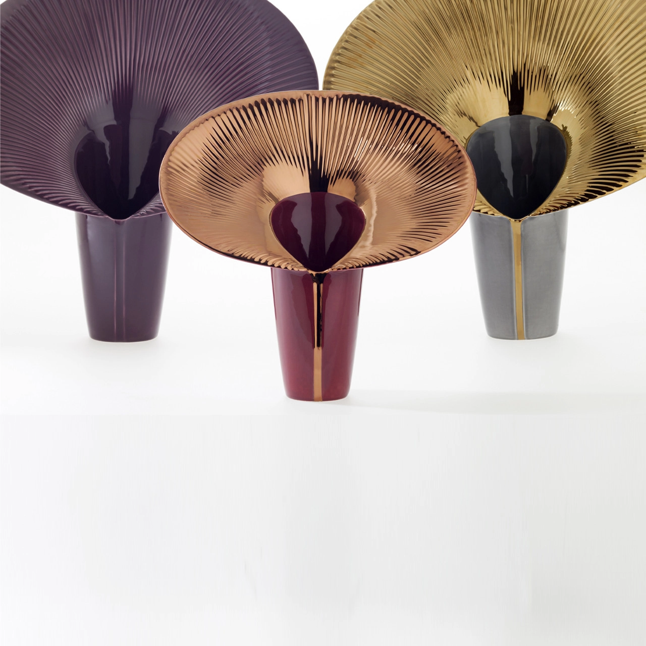 Fusca — это коллекция сладострастных ваз с органическими линиями и великолепной отделкой. Вызывающая форма и движение воротника дают волю воображению, от живописного платья дивы до гривы льва, а также цветка каллы.