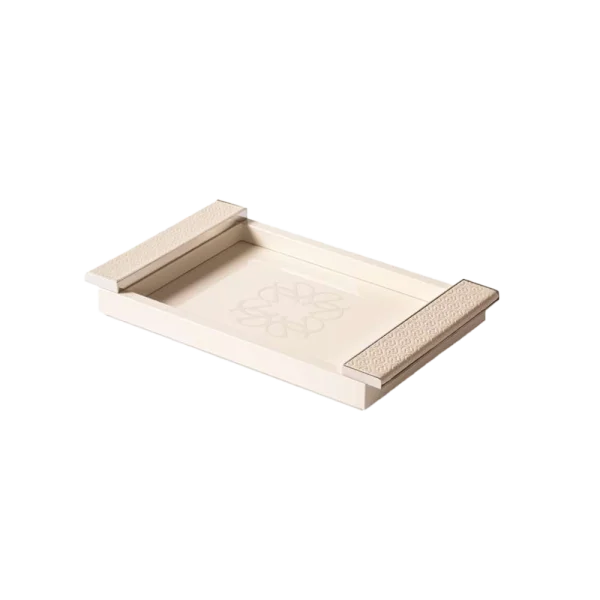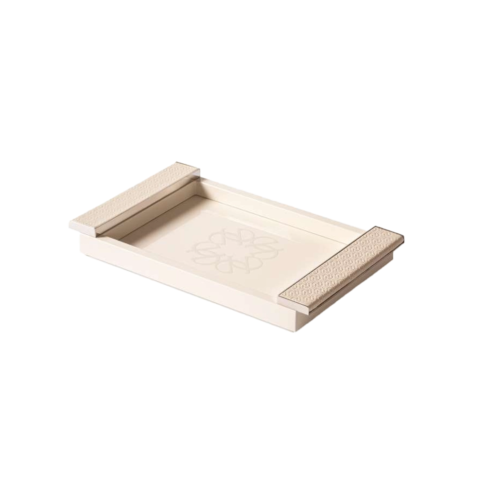 Лакированный поднос с резным верхом с монограммой и ручками, обтянутыми мягкой кожей ELIE SAAB Monogram pattern с бесшовным декоративным мотивом. Снабжен полированными деталями из палладия. Цвет лака всегда соответствует цвету кожи на ручках.