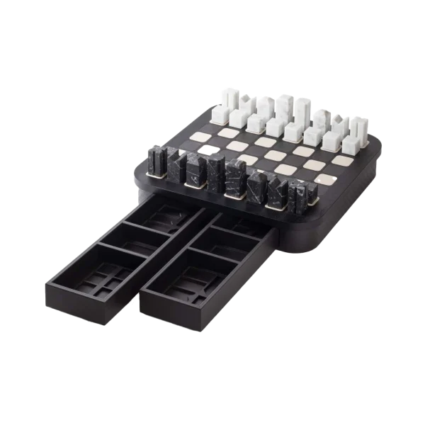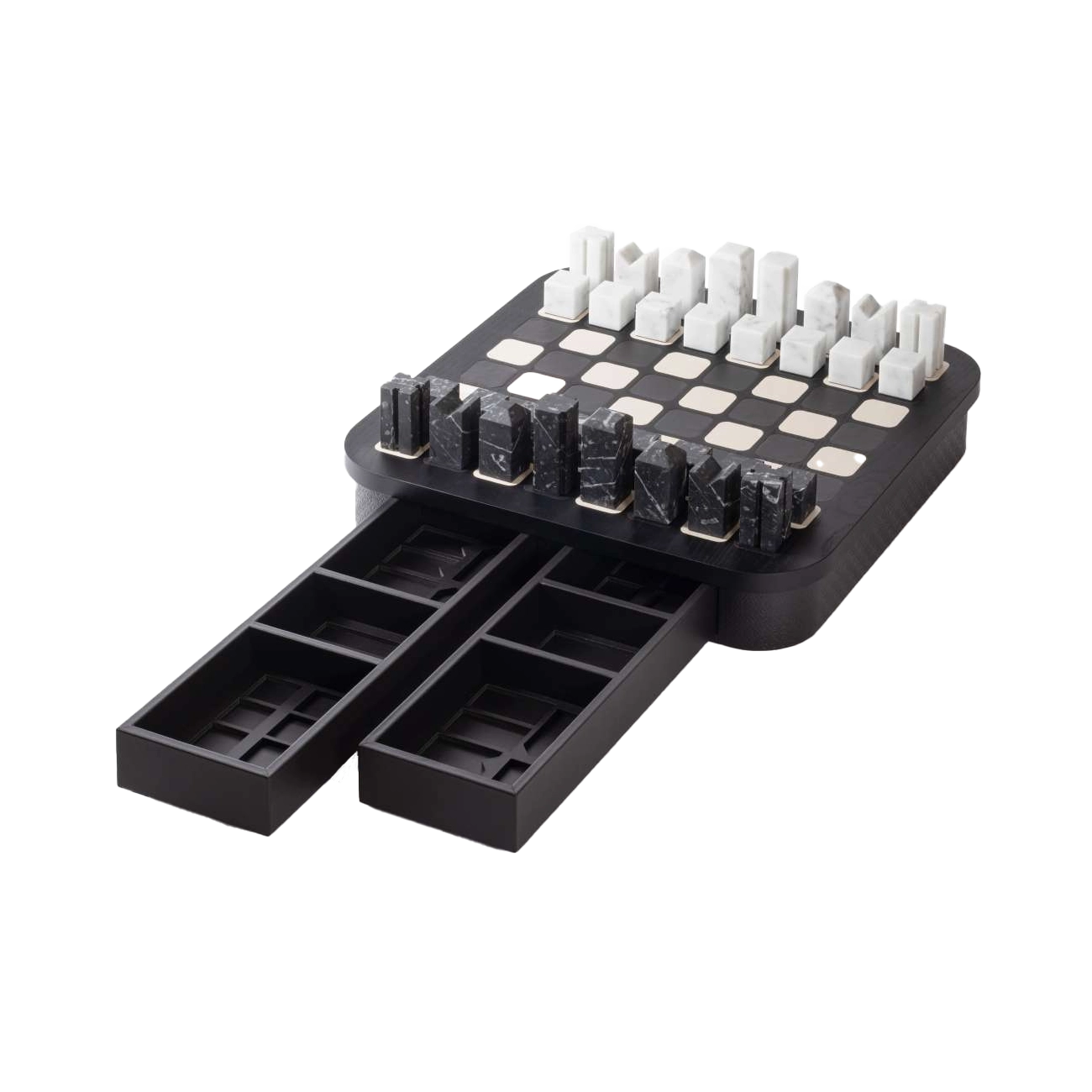 Игровой набор — шахматы Monogram от Giobagnara x Elie Saab имеет изысканную деревянную конструкцию со вставками из тонкой кожи высочайшего качества и основание, украшенное узором Elie Saab Monogram. Магнитные ящики в основании хранят два элегантных набора шахматных фигур из белого каррарского и черного марквинийского мрамора, добавляя нотку роскоши в вашу игру.