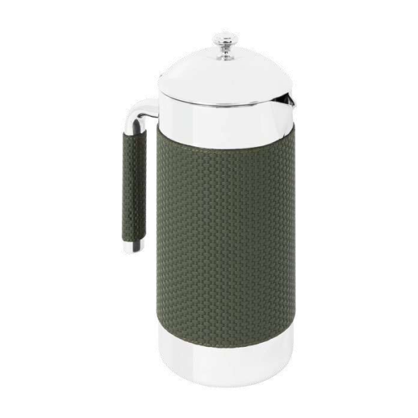 Частично обтянутый кожей изолированный графин из полированной нержавеющей стали.
