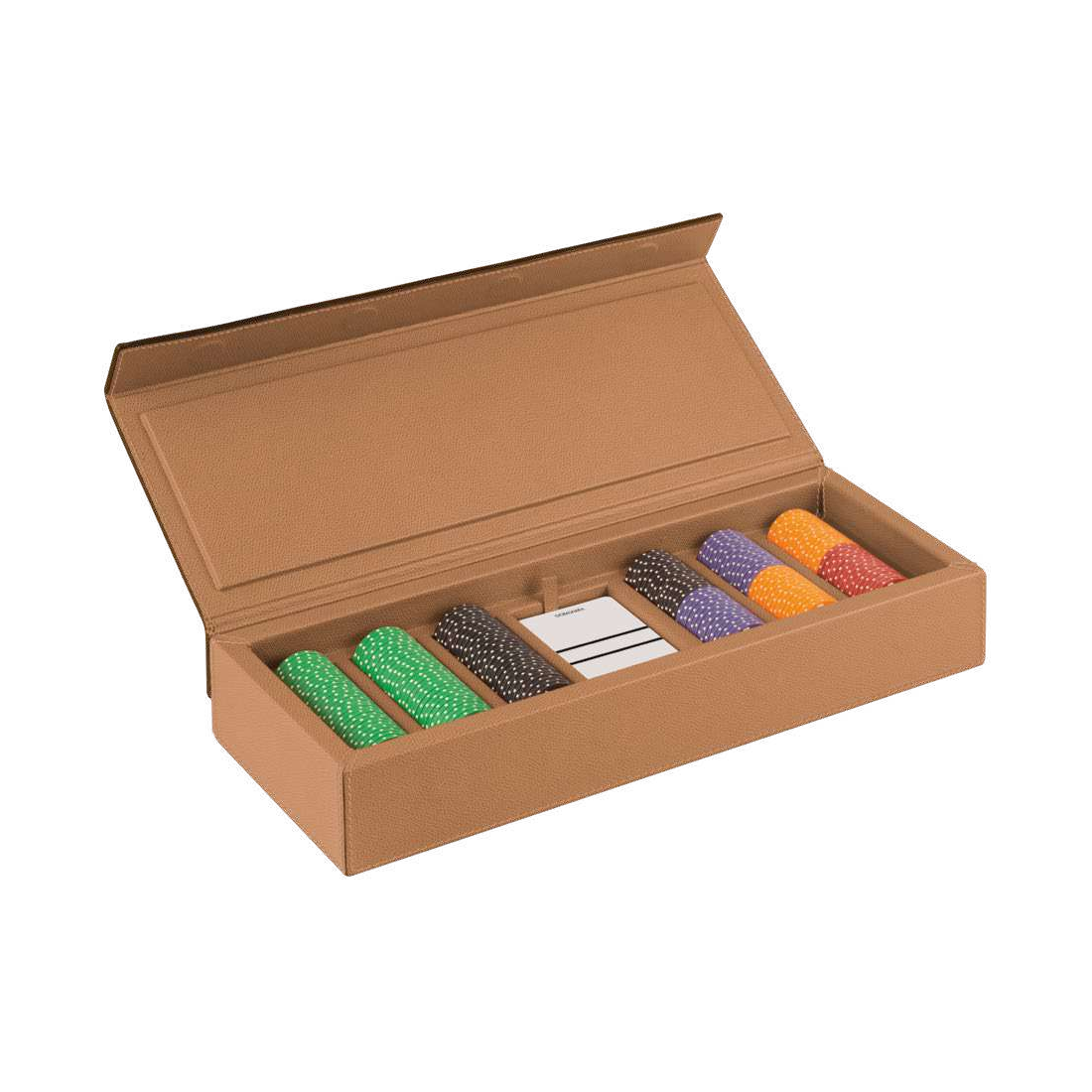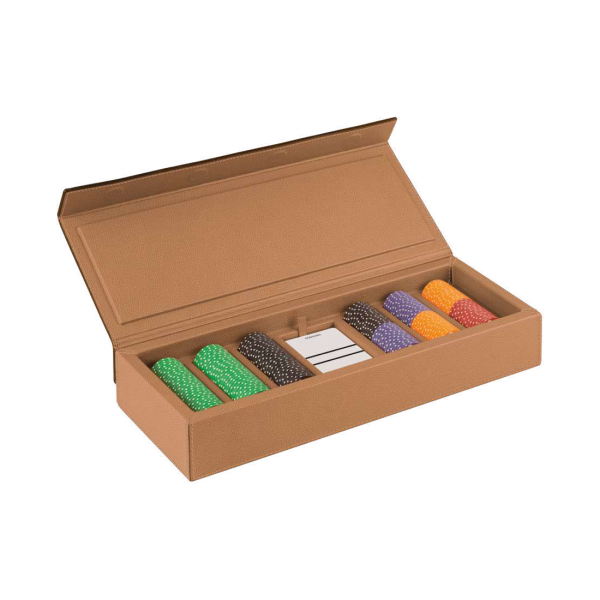 В комплект входит колода высококачественных игральных карт и покерные фишки 5 номиналов.