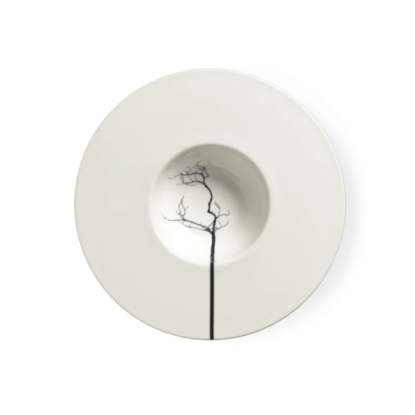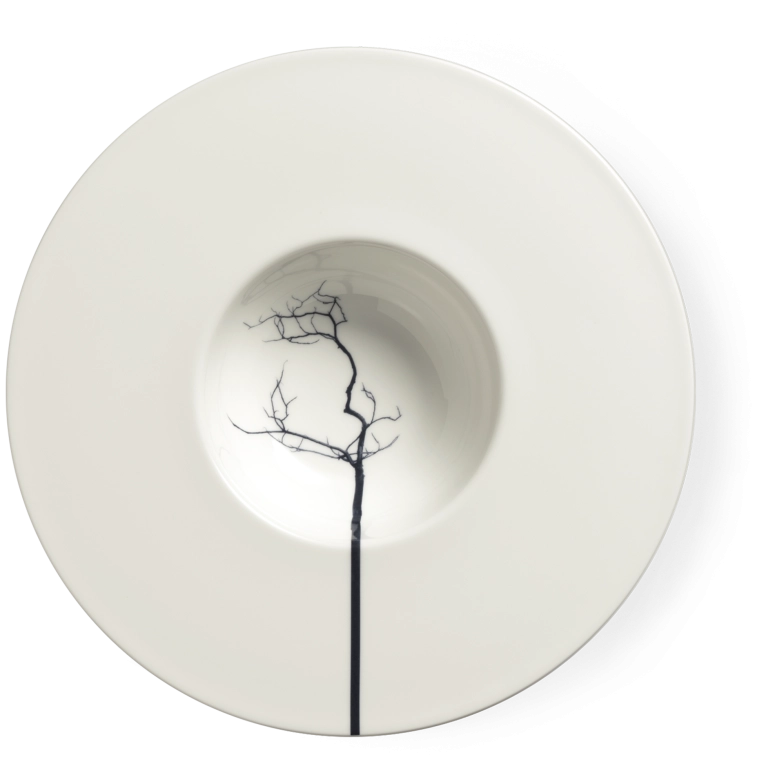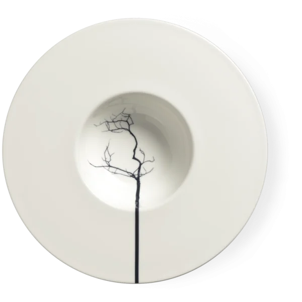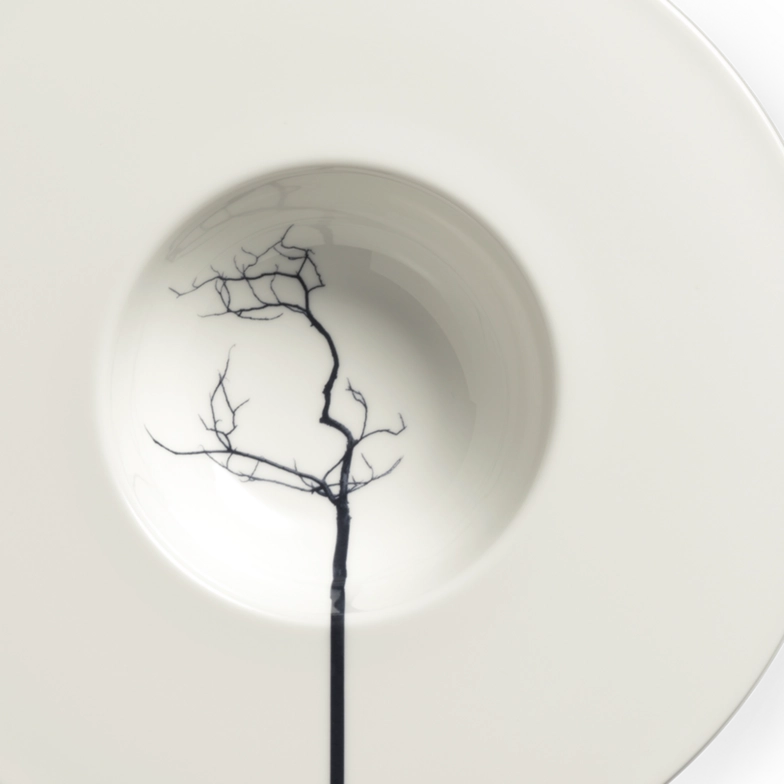 Вдохновленная природой, современная и индивидуально оформленная композиция. Различные силуэты черных деревьев изящно расходятся по чашкам и тарелкам, выглядя одновременно естественно и абстрактно. Ствол дерева продолжается за края чашек и превращается в графический элемент.