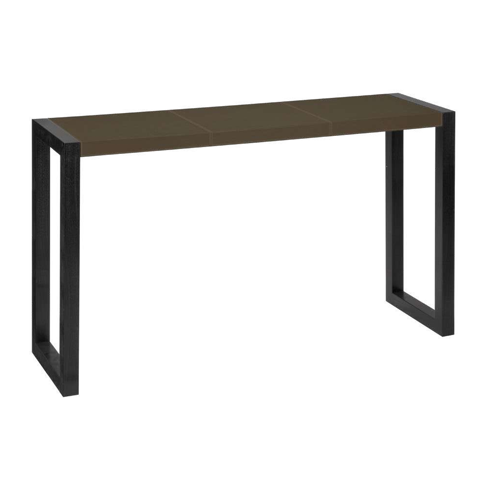 Дубовая конструкция, обтянутая кожей (предлагается в трех вариантах отделки), с инкрустацией кожей сверху и по бокам.