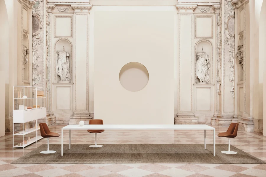 В основе Tense лежит технологически продвинутая конструкция. Благодаря инновационной системе внутреннего натяжения он обеспечивает устойчивость и лёгкость даже в больших размерах. Стол может достигать 4 метров в длину, сохраняя идеальный баланс между формой и функцией. Универсальность Tense отражается в широком диапазоне размеров, что делает его подходящим как для небольших помещений, так и для больших открытых пространств или столовых. В отделке использованы такие изысканные материалы, как Solid Surface и Fenix, которые элегантно дополняют как классические, так и современные интерьеры, сохраняя при этом безупречную эстетику.