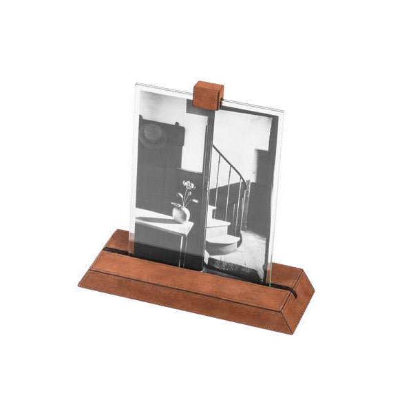 Деревянное основание, обтянутое телячьей кожей, с тремя полированными стеклянными рамами. Фотографии могут располагаться горизонтально или вертикально.
