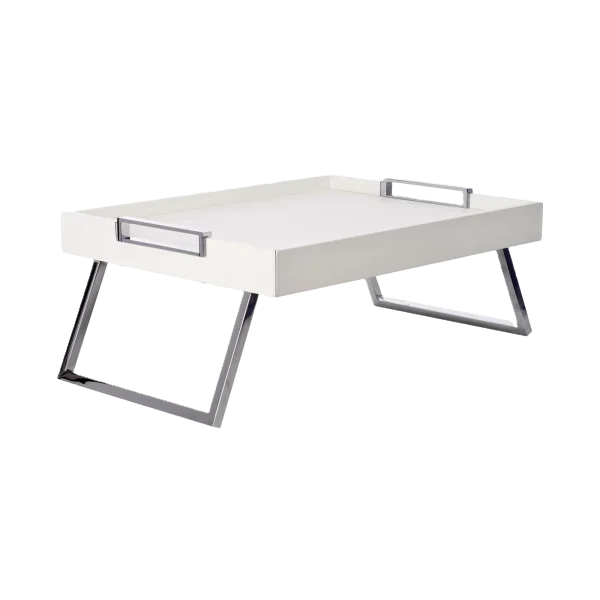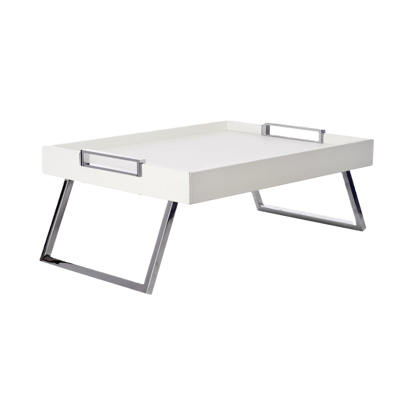 Поднос Vic , обтянутый телячьей кожей, имеет хромированное основание и ручки. Основание при необходимости раскладывается или убирается обратно. Отделка из телячьей кожи с водооталкивающим эффектом и устойчива к царапинам любого рода и легко моется тряпкой и мягким мылом.